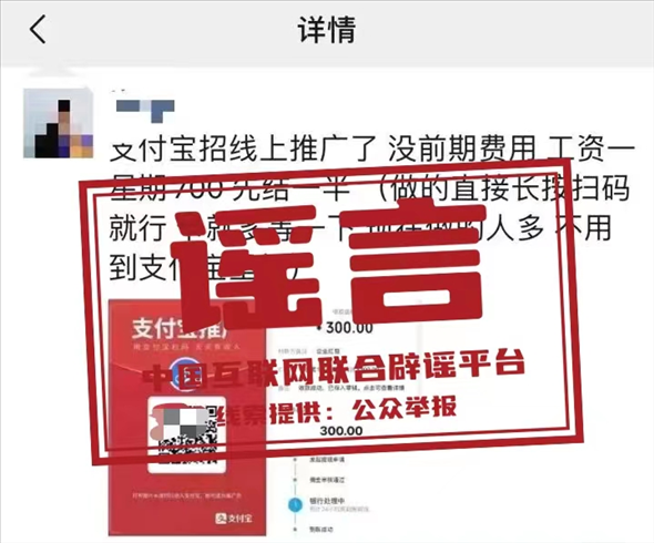 真相:近日,有網(wǎng)民向支付寶開放平臺反饋,看到有打著“螞蟻推廣”或“支付寶推廣”等旗號,聲稱“出租朋友圈可以賺取100/天”的推廣任務(wù)。對此,支付寶辟謠稱,此類活動均為詐騙,請勿輕信。