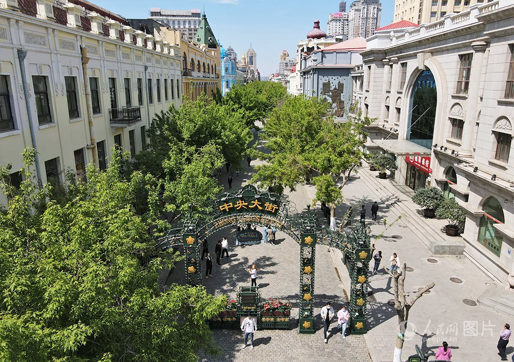 5月17日,游人漫步在哈爾濱市中央大街,感受百年老街的歐陸風情,盡賞冰城的夏日風光。人民網(wǎng) 蘇靖剛攝