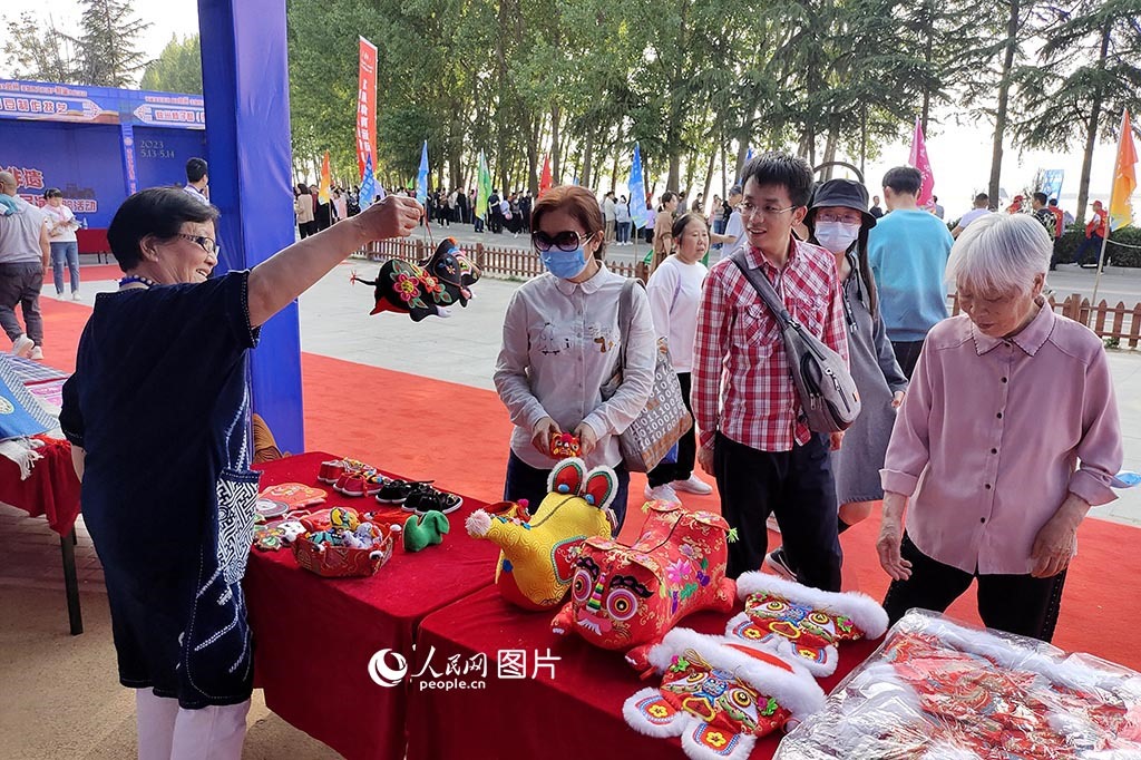 5月14日,“中國旅游日”主題周活動期間,河南省三門峽市陜州區(qū)在黃河岸邊舉辦“傳承多彩非遺”魅力陜州非物質(zhì)文化遺產(chǎn)展演體驗活動,大展傳統(tǒng)藝術(shù)魅力,為群眾獻上了一場“非遺文化盛宴”。在活動現(xiàn)場,當?shù)厥〖壏沁z傳承人向游客展示文創(chuàng)產(chǎn)品布老虎。人民網(wǎng)記者 王玉興攝