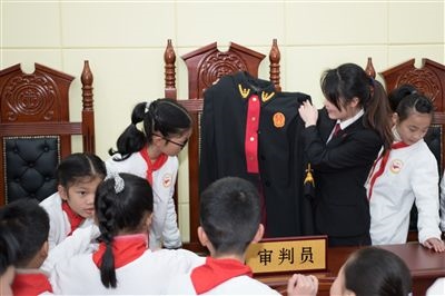 安源區(qū)法院“法之光”保護未成年人工作室的法官向?qū)W生講解法袍法徽知識。