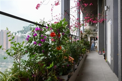 這棟“三角梅大樓”一共有32層(躍層),兩個單元,每層8戶,一共240戶人家。三角梅種植在每一層的公共空間長廊上,每家每戶前都有三角梅種植點。久而久之,每家每戶也在三角梅的基礎(chǔ)上,按照個人愛好興趣種植了更多的綠植、瓜果、蔬菜等,成為小區(qū)一景。