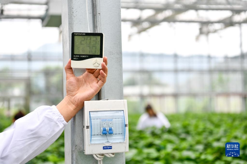 5月23日,工作人員在貴陽(yáng)市開陽(yáng)縣南江蔬菜良種繁育中心查看育苗大棚內(nèi)溫濕度。