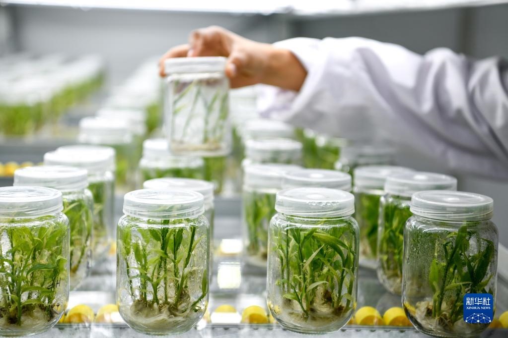 5月23日,工作人員在貴陽(yáng)市開陽(yáng)縣南江蔬菜良種繁育中心的組培中心查看小黃姜苗生長(zhǎng)情況。