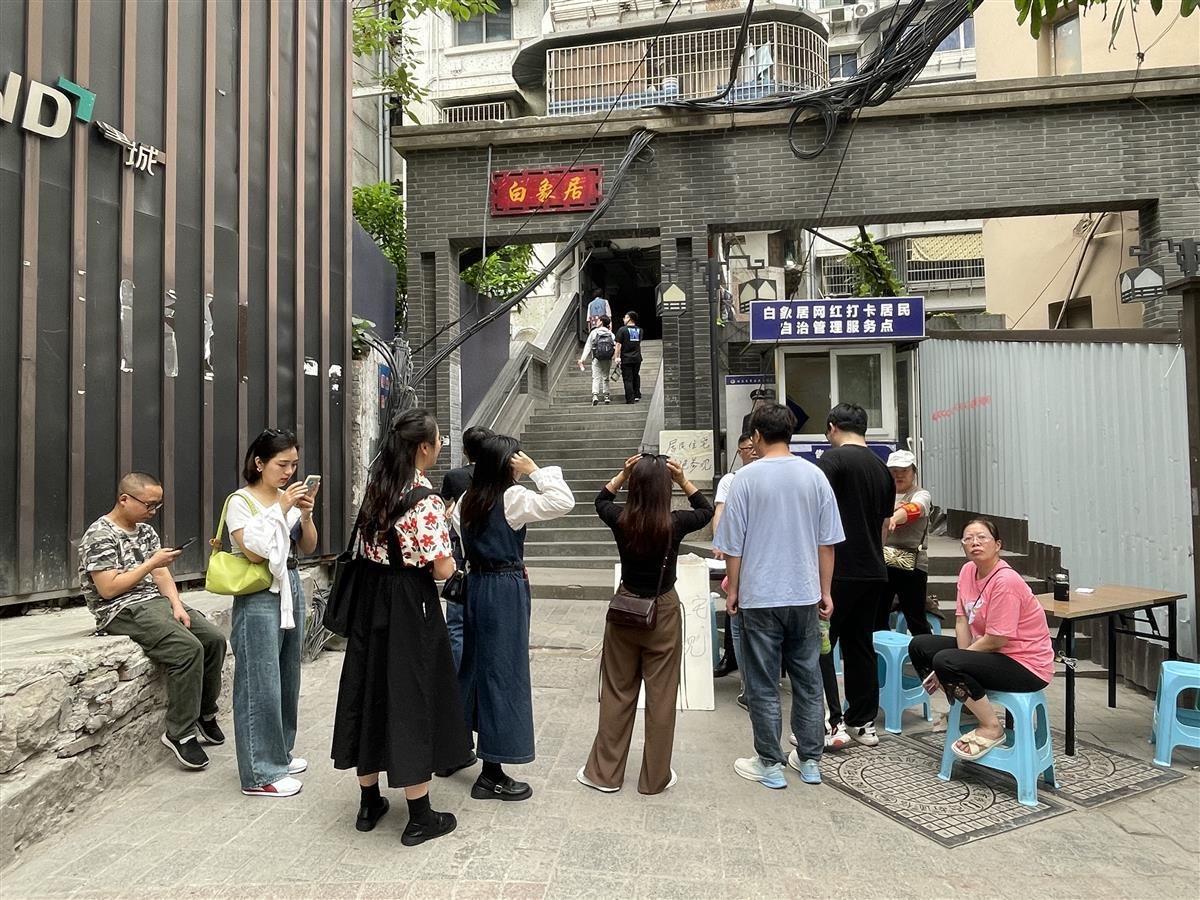 肩膀上掛著“白象居志愿聯(lián)盟網(wǎng)紅打卡秩序維護隊”紅袖章的潘先生告訴極目新聞記者,白象居住有500多戶居民,因游客蜂擁而至前來打卡,給居民們的日常生活造成不小困擾。居民們因此自發(fā)組織,通過勸導、疏通等方式維持游覽秩序。前兩天,他們設(shè)立“居民住宅,謝絕參觀”的招牌,但針對白象居探親訪友、民宿客人,可通過登記形式進入。