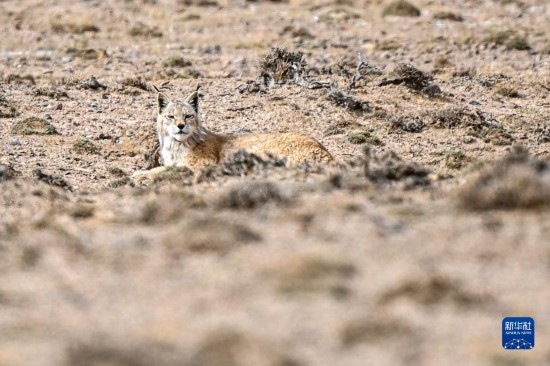 一只猞猁在阿爾金山國(guó)家級(jí)自然保護(hù)區(qū)休息(5月25日攝)。