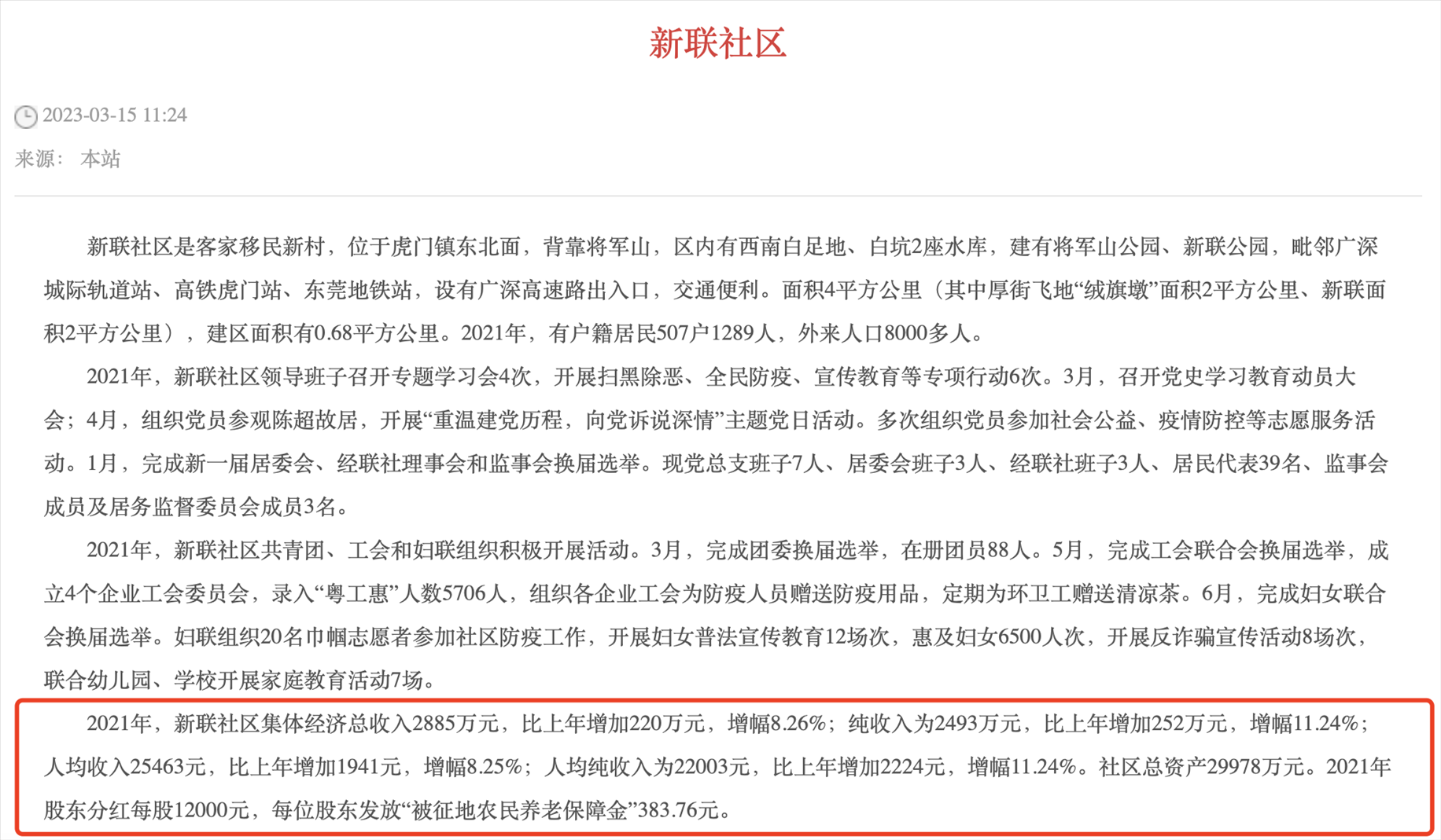 官網(wǎng)信息表明,2021年,新聯(lián)社區(qū)集體經(jīng)濟總收入已達到2885萬元,比上年增加220萬元,增幅8.26%;純收入為2493萬元,比上年增加252萬元,增幅11.24%。