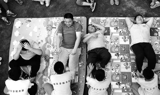 在一個中小學(xué)超重學(xué)生健康夏令營里,孩子們在做仰臥起坐。何海兒 攝/視覺中國