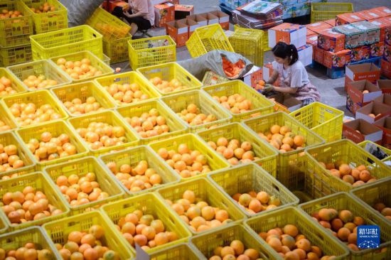 6月8日,在秭歸縣華維電商物流園區(qū)內(nèi),工作人員對臍橙進行裝箱處理。