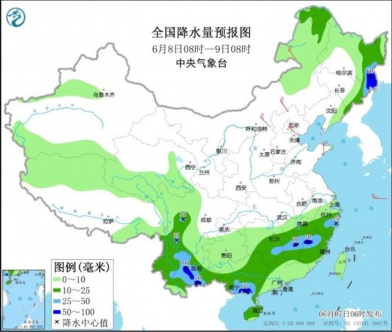 6月7日08時(shí)至8日08時(shí),內(nèi)蒙古東北部、黑龍江西北部、吉林東部、遼寧東部、四川西南部和南部、云南東北部和西部、貴州中部和西部、湖南東部、江西中北部、浙江大部、福建中北部、廣東大部、廣西中東部、海南島等地的部分地區(qū)有中到大雨,其中廣東西南部、廣西東南部、江西東北部、貴州西部等地局地有暴雨或大暴雨(100~150毫米)。內(nèi)蒙古中東部、河北北部等地的部分地區(qū)有4~6級(jí)風(fēng)(見(jiàn)圖1)。