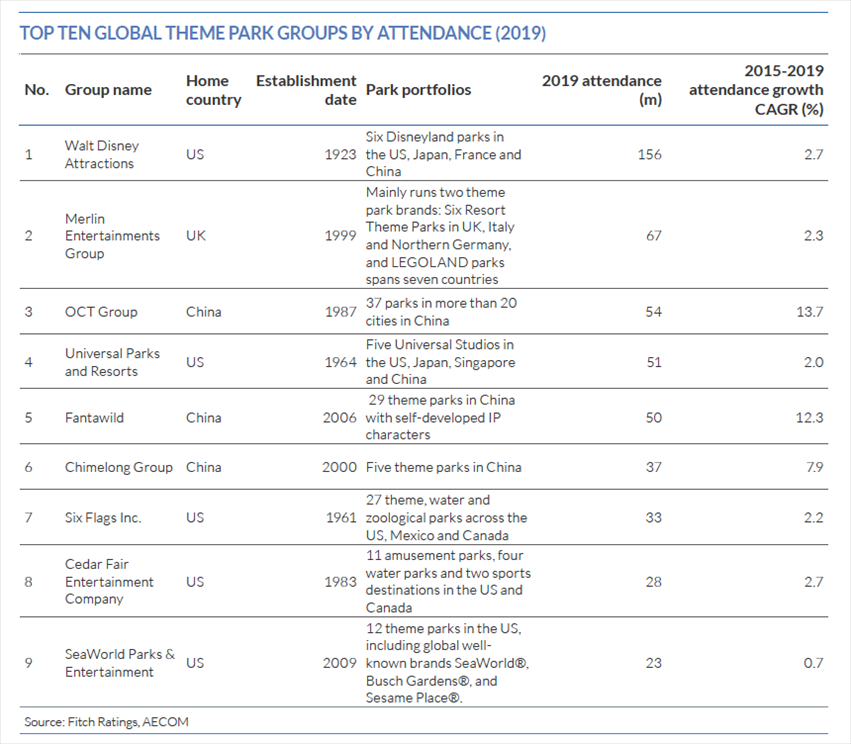惠譽(yù)評(píng)級(jí)發(fā)布的主題公園藍(lán)皮書也顯示,從2019年全球各大主題公園集團(tuán)旗下樂園的游客量來看,歡樂谷的母公司華僑城集團(tuán)位列第3,旗下主題公園2019年的游客量約5400萬人次;華強(qiáng)方特位列第5,旗下主題公園2019年的游客量約5000萬人次;長(zhǎng)隆集團(tuán)位列第6,旗下主題公園2019年的游客量約3700萬人次。