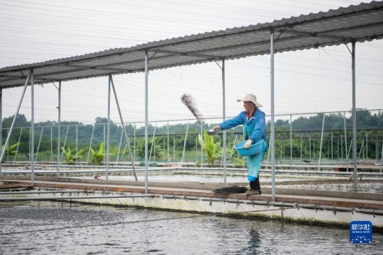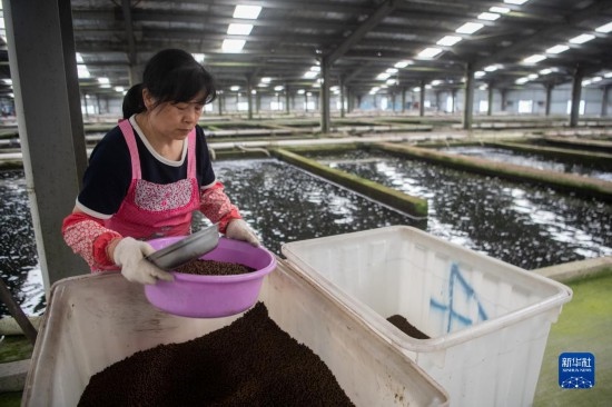 6月7日,中國(guó)清江(宜都)鱘魚谷工作人員在給鱘魚投喂餌料。
