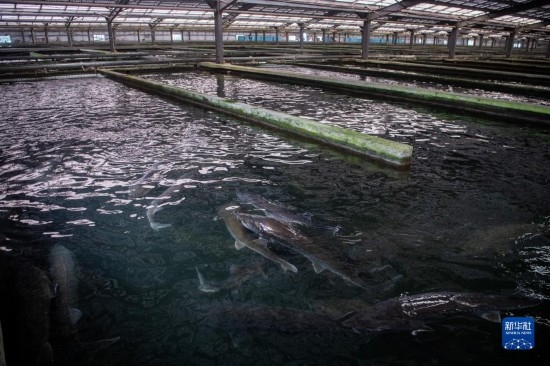 6月7日在中國(guó)清江(宜都)鱘魚谷養(yǎng)殖車間拍攝的鱘魚。