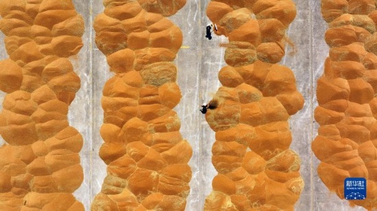 6月9日,江蘇省淮安市淮安區(qū)白馬湖農(nóng)場工人在晾曬小麥(無人機(jī)照片)。