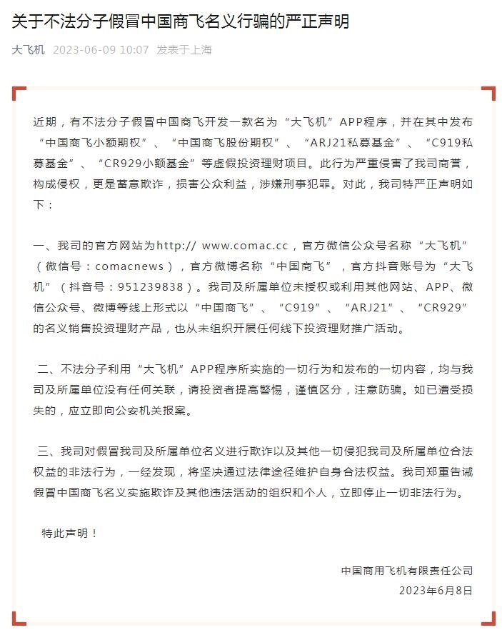 另據(jù)“大飛機(jī)”微信公眾號6月9日發(fā)布的《關(guān)于不法分子假冒中國商飛名義行騙的嚴(yán)正聲明》,有不法分子假冒中國商飛開發(fā)一款名為“大飛機(jī)”APP程序,并在其中發(fā)布“中國商飛小額期權(quán)”、“中國商飛股份期權(quán)”、“ARJ21私募基金”、“C919私募基金”、“CR929小額基金”等虛假投資理財項目。