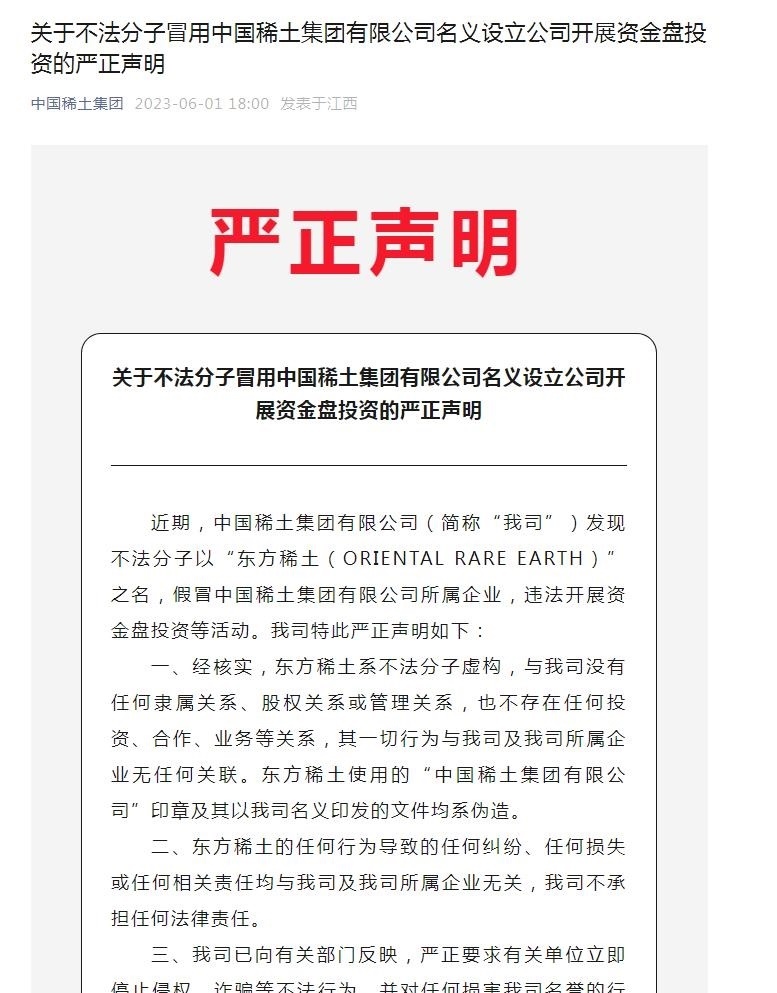 “中國稀土集團(tuán)”微信公眾號曾在6月1日發(fā)布嚴(yán)正聲明提醒,近期,中國稀土集團(tuán)有限公司(下稱“中國稀土”)發(fā)現(xiàn)不法分子以“東方稀土(ORIENTAL RARE EARTH)”之名,假冒中國稀土集團(tuán)有限公司所屬企業(yè),違法開展資金盤投資等活動。