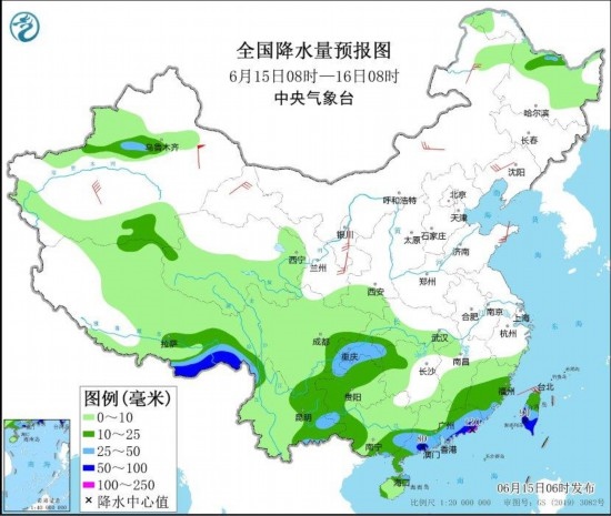 全國降水量預(yù)報(bào)圖(6月15日08時(shí)-16日08時(shí)) 圖自中央氣象臺(tái)網(wǎng)站