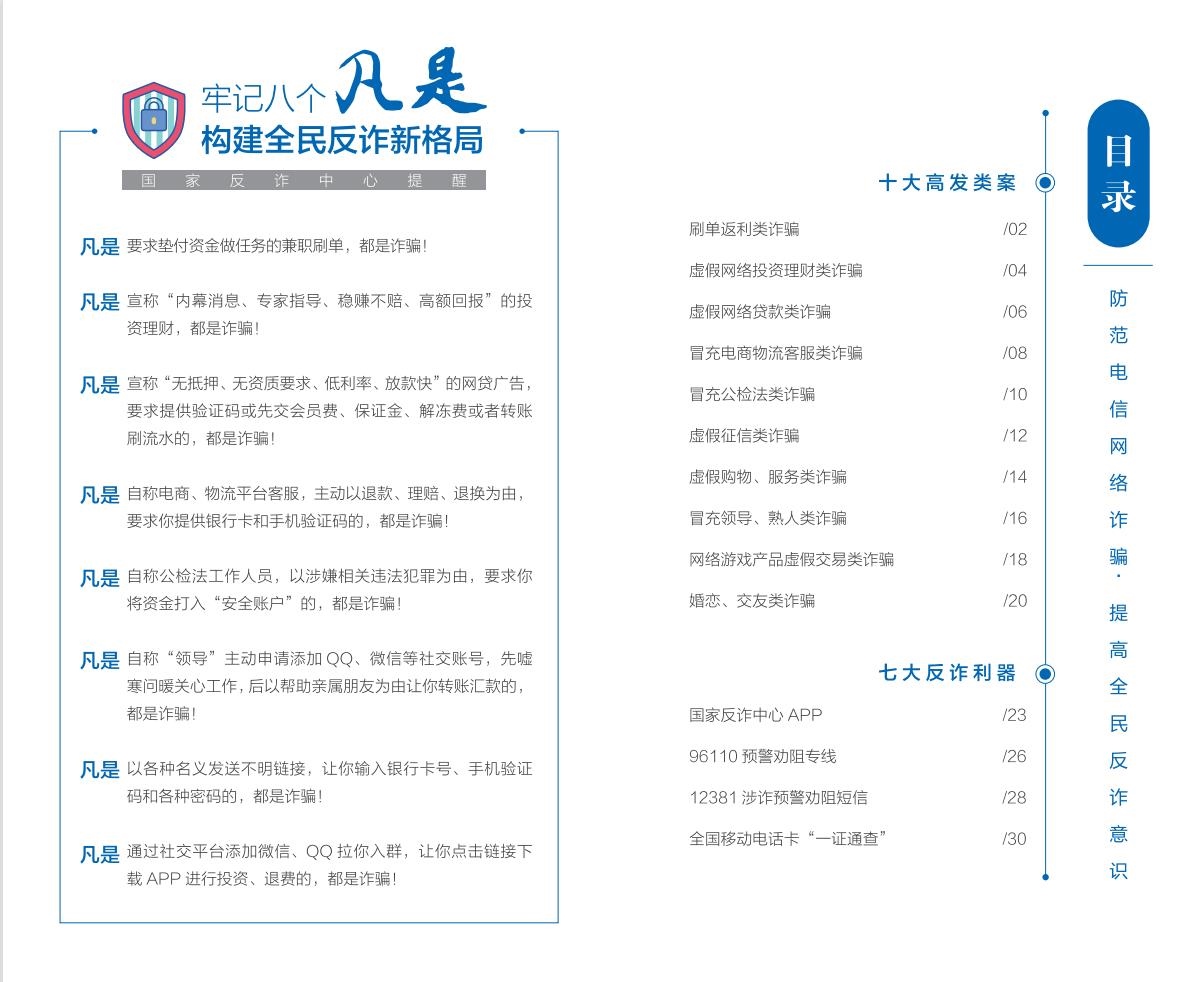 聚焦“關(guān)口前移、預(yù)防為先”,《手冊》詳細(xì)介紹了過去兩年里,公安部會同工信部、中國人民銀行聯(lián)合推出的七大反詐利器——國家反詐中心APP、96110預(yù)警勸阻專線、12381涉詐預(yù)警勸阻短信系統(tǒng)、全國移動電話卡“一證通查”、云閃付APP“一鍵查卡”、反詐名片、全國互聯(lián)網(wǎng)賬號“一證通查2.0”的主要功能和下載查詢方法,鼓勵(lì)廣大群眾多下載多使用,共同構(gòu)筑攔截電信網(wǎng)絡(luò)詐騙的“防火墻”。