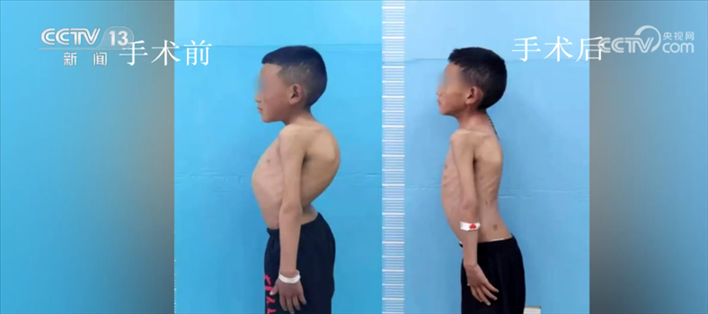 北京大學(xué)人民醫(yī)院脊柱外科主任 劉海鷹:另外這兩個(gè)特別重的孩子,我們做的頭盆環(huán)牽引,牽引上以后,先到康復(fù)醫(yī)院那邊,定期給它一點(diǎn)一點(diǎn)撐開,差不多兩三個(gè)月以后,撐到一定程度以后,把胸腔都打開了,肺功能也改善了以后,對于麻醉對于手術(shù)來說更安全,另外對于神經(jīng)功能也比較安全了,在這種前提下我們做一個(gè)固定的矯正的手術(shù)。預(yù)期來說,矯正70%-80%應(yīng)該沒問題,矯正到外表上基本上看不見。
