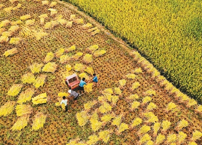 湖南省郴州市桂陽縣蓮塘鎮(zhèn)下馬村,村民在高山梯田里收割水稻。 周秀魚春攝(新華社發(fā)) |