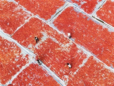 安徽省亳州市譙城區(qū)雙溝鎮(zhèn)任小廟村,農(nóng)民在晾曬剛采收的辣椒。 劉勤利攝(人民視覺) |