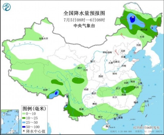 全國降水量預報圖(7月5日08時-6日08時)。圖片來源:中央氣象臺網(wǎng)站