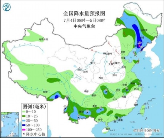 全國降水量預報圖(7月3日08時-4日08時)。圖片來源:中央氣象臺網(wǎng)站