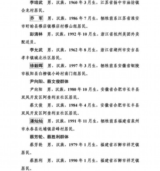 上榜勇士中,有從高橋上跳水救人導(dǎo)致胸椎骨折的外賣小哥彭清林和另一位高橋跳水救人的中學(xué)教師丁成闖;有冒著9級大風(fēng)在海上營救遇險臺胞的漁民蔡芳輪、蔡勝利;有放棄登頂珠峰機(jī)會而救助同胞的珠峰登山隊(duì)隊(duì)員范江濤、謝如祥;有萬米高空機(jī)艙里搶救瀕危病人的護(hù)士長劉素琴;有勇斗盜賊被刺幾刀仍不退縮的江蘇村民李培武;有身患癌癥卻橫渡淥江河救人的樂觀大姐鐘慧慈;有跳進(jìn)充滿沼氣深井救人致多器官感染的山東小伙李字旭;更有冒死救援落水群眾壯烈犧牲的潘燦燦、朱先鴿、尹新朋、喬軍、徐毅暉、楊華清、陳江七位勇士,讓我們致以最崇高的敬意!
