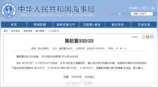 ·航行警告!7月10日0時(shí)至7月14日24時(shí),渤海部分海域進(jìn)行實(shí)彈射擊活動(dòng),禁止駛?cè)搿?/p>