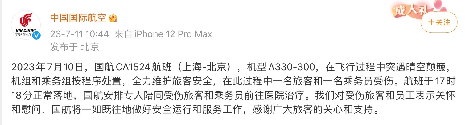 7月11日,中國國際航空在其官方微博發(fā)布通報(bào):2023年7月10日,國航CA1524航班(上海-北京),機(jī)型A330-300,在飛行過程中突遇晴空顛簸,機(jī)組和乘務(wù)組按程序處置,全力維護(hù)旅客安全,在此過程中一名旅客和一名乘務(wù)員受傷。航班于17時(shí)18分正常落地,國航安排專人陪同受傷旅客和乘務(wù)員前往醫(yī)院治療。