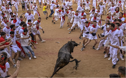 當?shù)貢r間2023年7月10日,西班牙潘普洛納,圣費爾明節(jié)期間,狂歡者站在公牛周圍,公牛進入斗牛場。