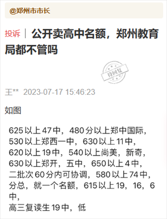7月16日,有群眾通過(guò)頂端新聞“我想@領(lǐng)導(dǎo)”平臺(tái)向鄭州市教育局局長(zhǎng)留言:“掏錢(qián)就能上?鄭州中招販賣(mài)名額成風(fēng)”“公開(kāi)賣(mài)高中名額,鄭州教育局都不管嗎”等類(lèi)似留言。