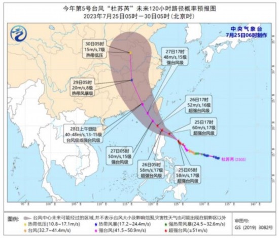 圖2 臺風(fēng)“杜蘇芮”未來120小時路徑概率預(yù)報圖(7月25日05時-30日05時)