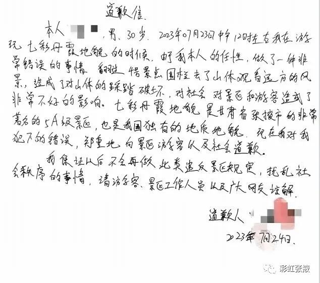 同時(shí),張掖丹霞大景區(qū)管理委員會(huì)(張掖國(guó)家地質(zhì)公園管理局)微信公眾號(hào)還發(fā)布了這名游客的道歉信。該游客稱“由于本人的任性,做了一件非常錯(cuò)誤的事情,翻過4號(hào)景點(diǎn)圍欄去了山體觀看遠(yuǎn)方的風(fēng)景,造成了對(duì)山體的踩踏破壞,對(duì)社會(huì)、對(duì)景區(qū)和游客造成了非常不好的影響。”
