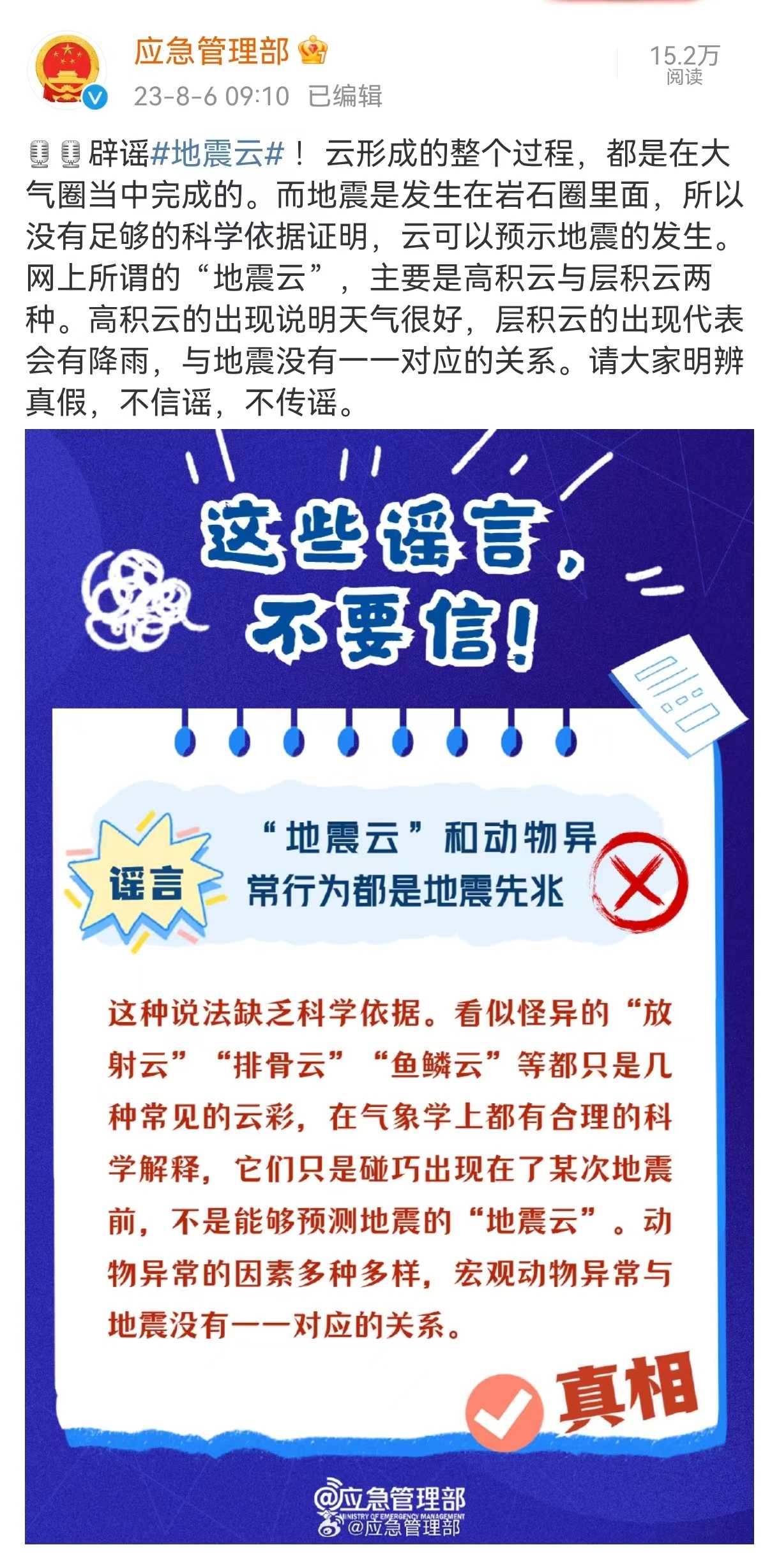 人民網(wǎng)北京8月6日電 (周靜圓)據(jù)中國地震臺網(wǎng)正式測定:8月6日2時(shí)33分在山東省德州市平原縣發(fā)生5.5級地震,震源深度10千米。地震發(fā)生后,有網(wǎng)友曬出自己拍下的云層,有關(guān)“地震云能預(yù)測地震”的說法在網(wǎng)絡(luò)上廣泛傳播。8月6日,應(yīng)急管理部官方微博就所謂“地震云”相關(guān)說法進(jìn)行辟謠。