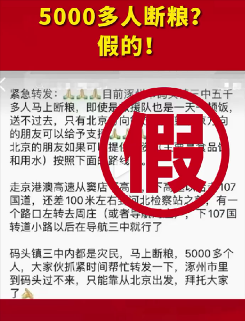 8月7日,“涿州發(fā)布”辟謠稱,網(wǎng)傳消息不實(shí)。同時(shí),“涿州發(fā)布”還呼吁網(wǎng)民共同抵制網(wǎng)絡(luò)謠言。