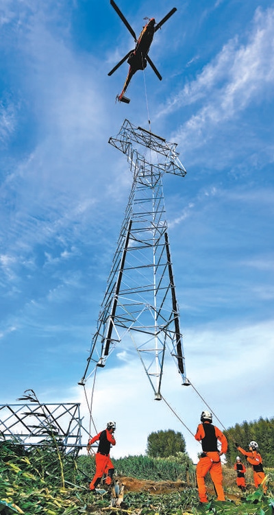 8月9日,國家電網(wǎng)公司調(diào)配直升機(jī)支援黑龍江電力恢復(fù)工作。圖為直升機(jī)在牡丹江海林110千伏海長(zhǎng)線搶修現(xiàn)場(chǎng)整塔吊裝作業(yè)中。方 圓 張恩全攝影報(bào)道