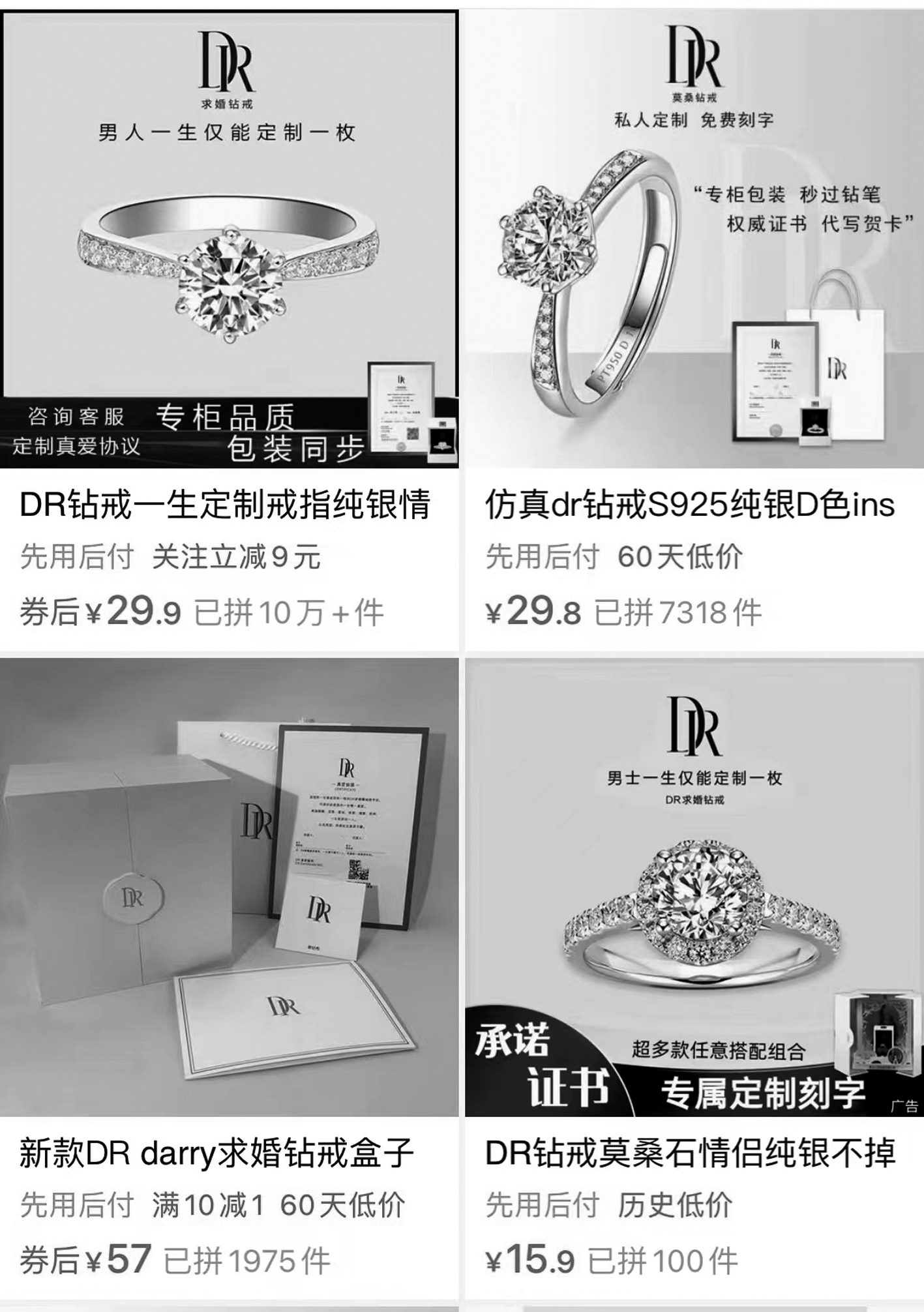 記者在一家電商平臺輸入“DR鉆戒”,映入眼簾的商品售價只要幾十塊,幾乎都把“男士一生僅能定制一枚”作為賣點。還有商家寫道,“專柜品質、包裝同步”“咨詢客服定制真愛協(xié)議”。