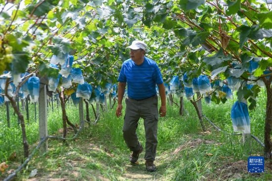 8月20日,在諸暨市姚江鎮(zhèn)浦西村純禾生態(tài)園內,種植戶何建華查看葡萄的長勢。