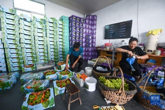 8月20日,在諸暨市姚江鎮(zhèn)紫草塢村阿群家庭農場內,種植戶打包成熟的葡萄,準備運往市場。