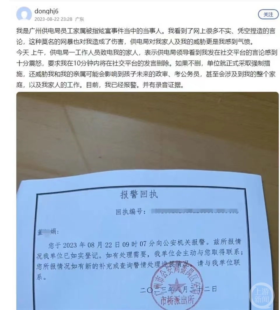 22日晚23時,自稱是舉報當事人阿娟的網(wǎng)友發(fā)布了報警回執(zhí),并發(fā)帖稱當日上午,供電局一工作人員致電她的家人,“表示供電局領(lǐng)導(dǎo)看到我發(fā)在社交平臺的言論感到十分震怒,要求我在10分鐘內(nèi)將在社交平臺的發(fā)言刪除。如果不刪,單位就正式采取強制措施,還威脅我和我的親屬,(此舉)可能會影響到孩子未來的政審、考公務(wù)員,甚至?xí)婕暗轿业恼麄€家庭,以及我家人的工作。目前,我已經(jīng)報警。并有錄音證據(jù)?!?/p>