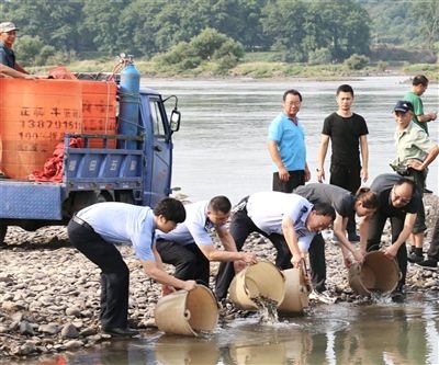 弋陽法院法官聯(lián)合相關(guān)部門開展增殖放流活動(dòng)。