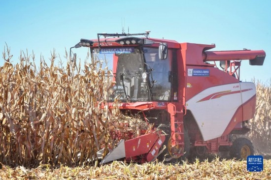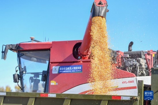 10月19日,在中國科學院“黑土糧倉”科技會戰(zhàn)長春示范區(qū)公主嶺示范基地,無人駕駛農(nóng)機在收獲玉米。