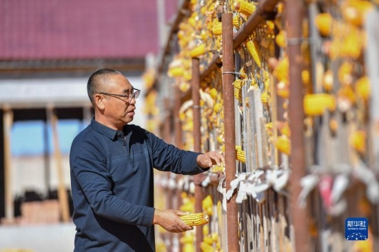 10月19日,在吉林省公主嶺市友忠種植農(nóng)民專業(yè)合作社,理事長孫友忠查看科學儲糧倉中的玉米儲存情況。