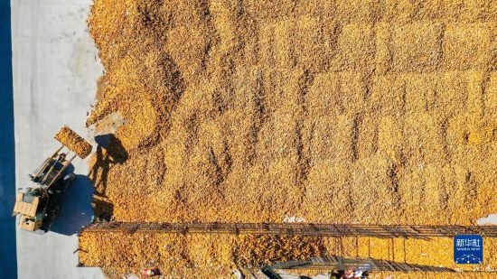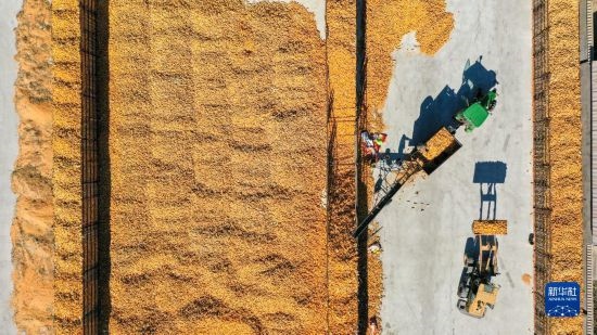 10月19日,在吉林省公主嶺市友忠種植農(nóng)民專業(yè)合作社,農(nóng)民將收獲的玉米放入科學儲糧倉(無人機照片)。