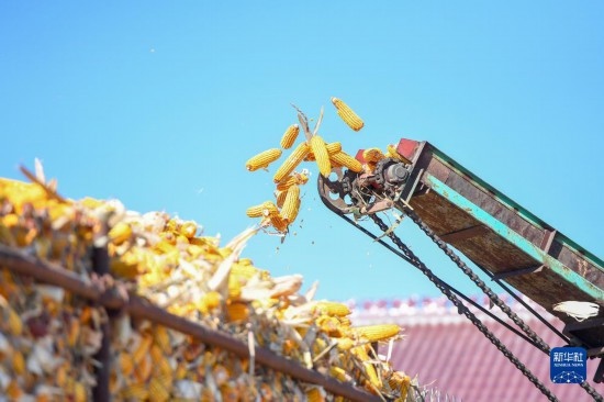 10月19日,在吉林省公主嶺市友忠種植農(nóng)民專業(yè)合作社,農(nóng)民將收獲的玉米放入科學儲糧倉。