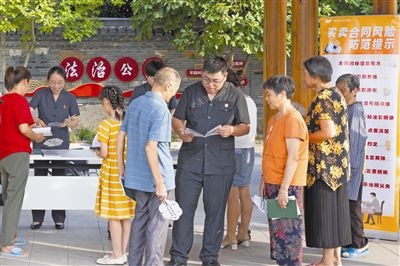 圖⑧:送法入村。圖為楓橋法庭通過設立“糾紛移動普法站”,來到轄區(qū)各村鎮(zhèn)普法宣傳,送上普法小手冊,提醒村民用好法律知識,提前防范各類風險。