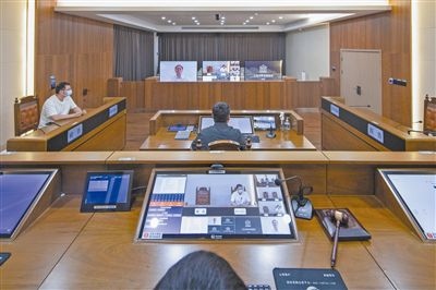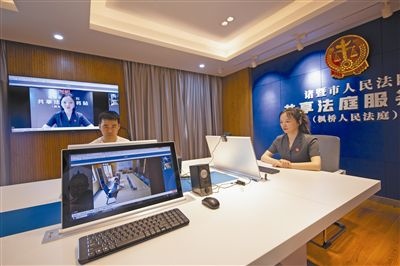 圖③:智慧建設。圖為諸暨法院楓橋人民法庭在審理一起民間糾紛案件中,因當事人一方遠在外地,故組織雙方線上開庭,當事人表示相當滿意。
