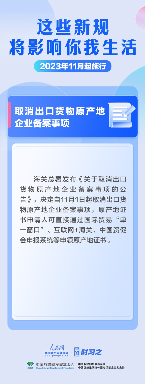 調(diào)整最高法知產(chǎn)法庭審理上訴案件范圍;簡(jiǎn)化債券發(fā)行人員任職資格審批程序;取消出口貨物原產(chǎn)地企業(yè)備案事項(xiàng)……11月,這些新規(guī)施行,將影響你我生活。