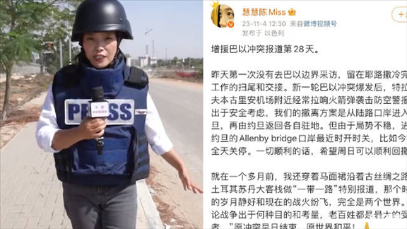 戰(zhàn)地女記者陳慧慧稱將回撤:愿沖突早日結(jié)束,愿世界和平!11月3日,報道巴以沖突的中央廣播電視總臺女記者陳慧慧上了熱搜。10月9日她在前線發(fā)回第一篇報道,到4日為止她已經(jīng)在戰(zhàn)地堅持了整整28天。