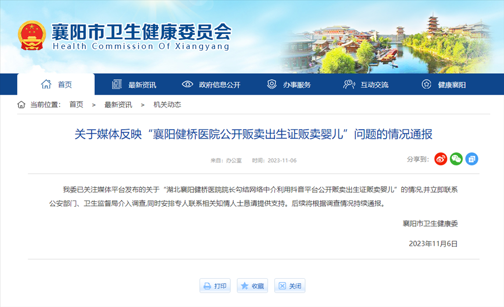 ·醫(yī)院院長被舉報涉嫌販賣出生證,襄陽衛(wèi)健委通報:聯(lián)系公安部門、衛(wèi)生監(jiān)督局介入調(diào)查,同時安排專人聯(lián)系相關(guān)知情人士懇請?zhí)峁┲С?。后續(xù)將根據(jù)調(diào)查情況持續(xù)通報。